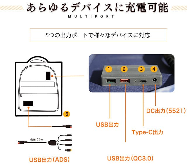 - USB Type-A、USBQC3.0、USB Type-C、DC